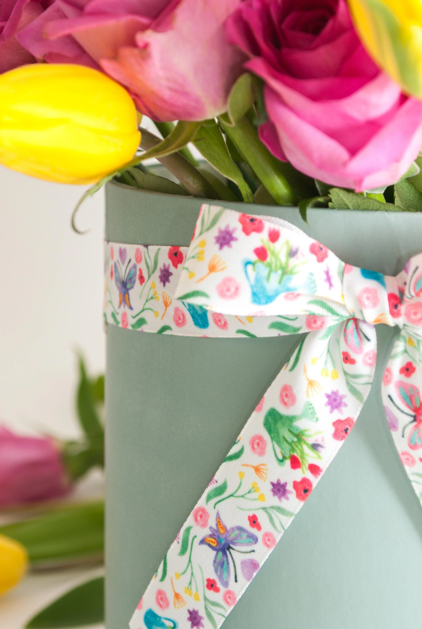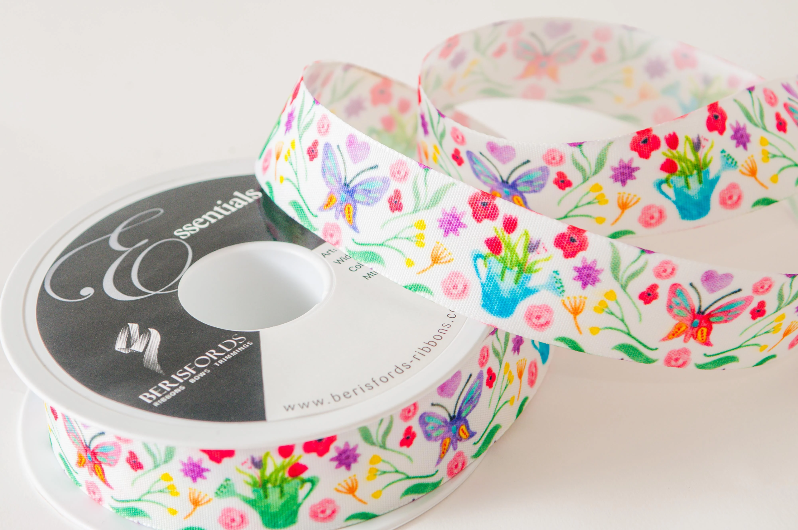 This flower patch ribbon features a floral pattern along with butterfly & watering can.