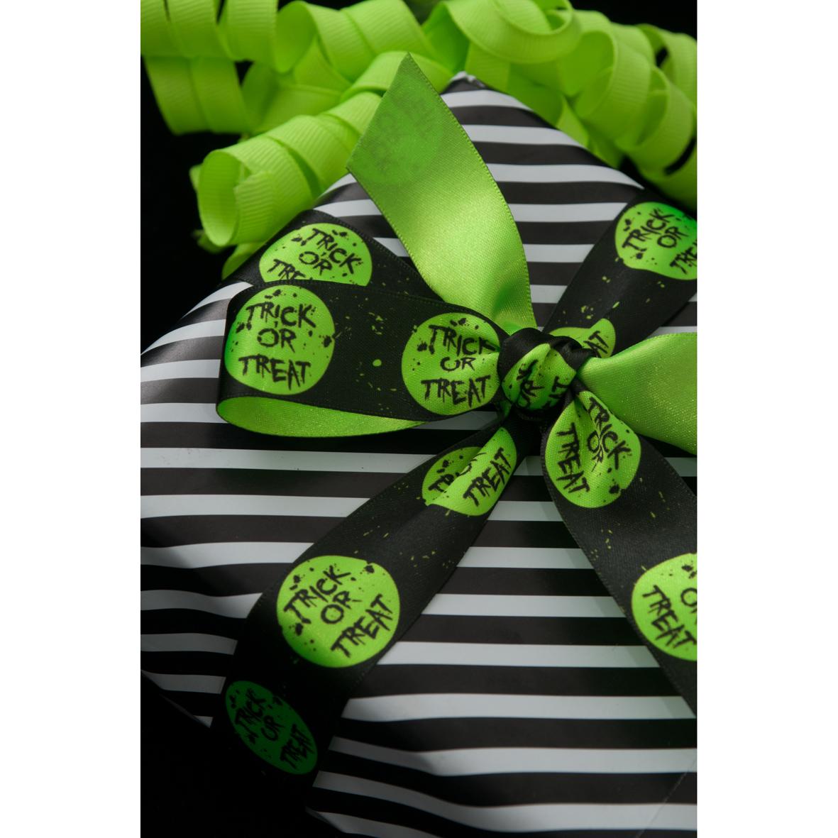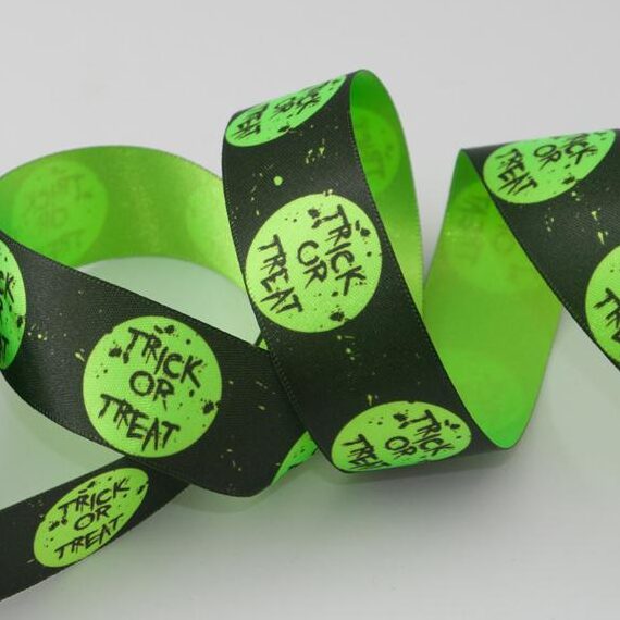 Fluorescent Green Trick or Treat print on black satin ribbon.