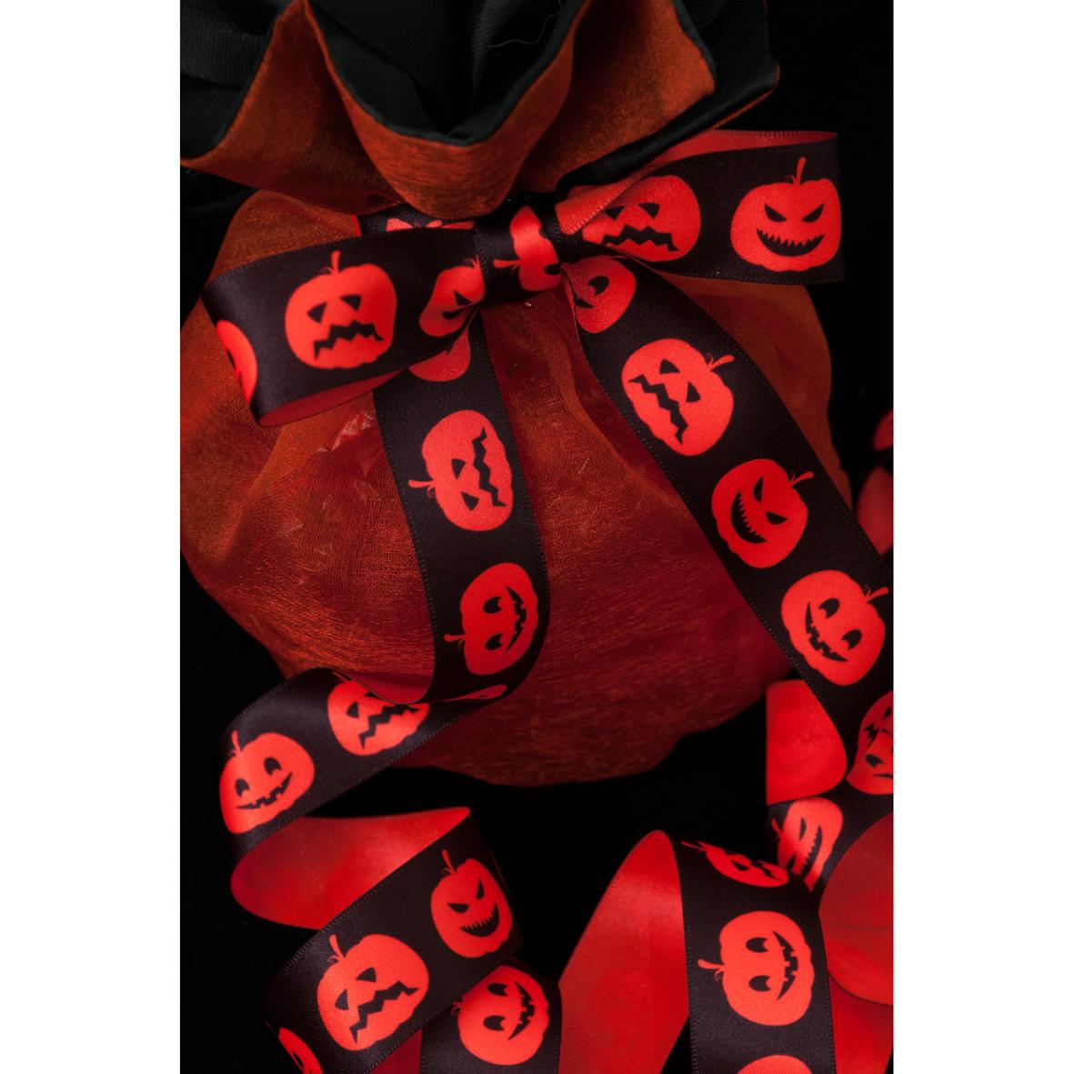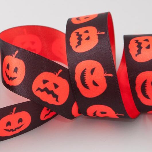 Fluorescent Orange Pumpkins print on black satin ribbon.