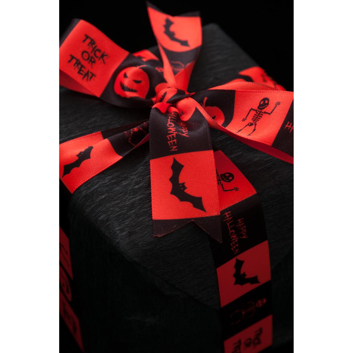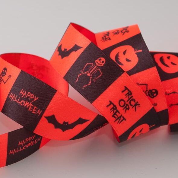 Fluorescent Orange Spooky Friends print on black satin ribbon.