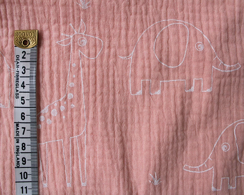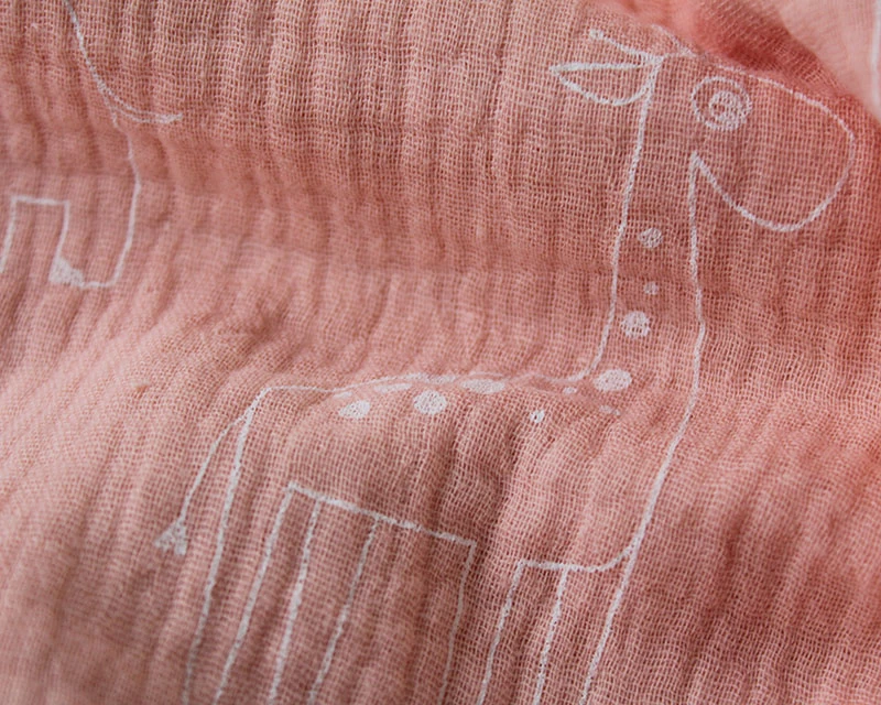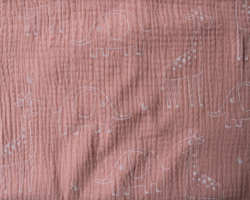 Double gauze is a fabric that consists of two layers of fine open woven cotton. They are attached together with tiny stab stitches at regular intervals, usually every centimeter, in a grid pattern, though this is barely visible. It is incredibly soft to touch and can be a tiny bit transparent.