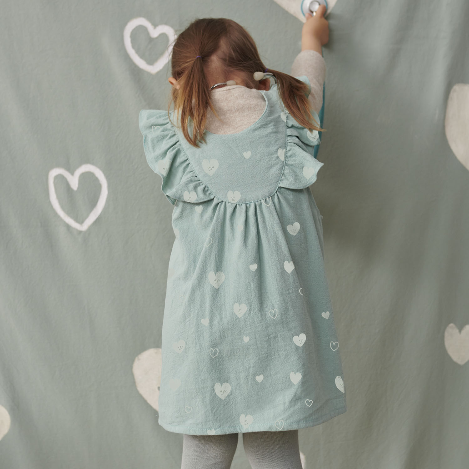 A 100% cotton fabric in aqua with a heart print, heavier weight than a basic poplin with a soft feel and a rustic but pleasant texture.