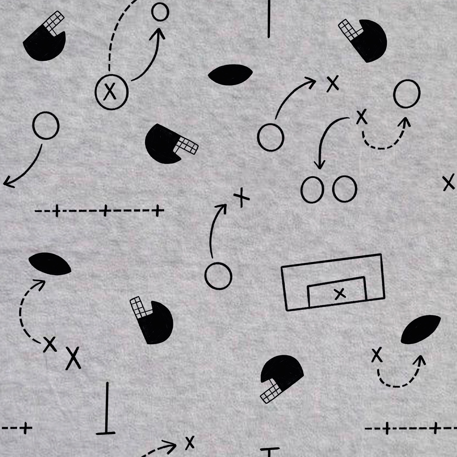 A t-shirt jersey fabric with a black rugby print including balls, helmets and goalposts, on a melange grey background. Its soft cotton feel with elastane makes it perfect to sew comfortable garments like dresses, t-shirts, and pyjamas, particularly for children.